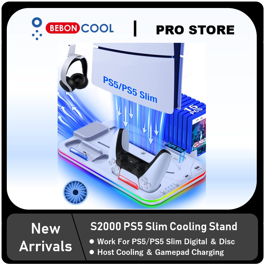 BEBONCOOL S2001 RGB Cooling Stand For PS5 Slim/PS5 Digital/Disc Vertical Cooling Station Cooler PS5 DualSence Gamepad Charger