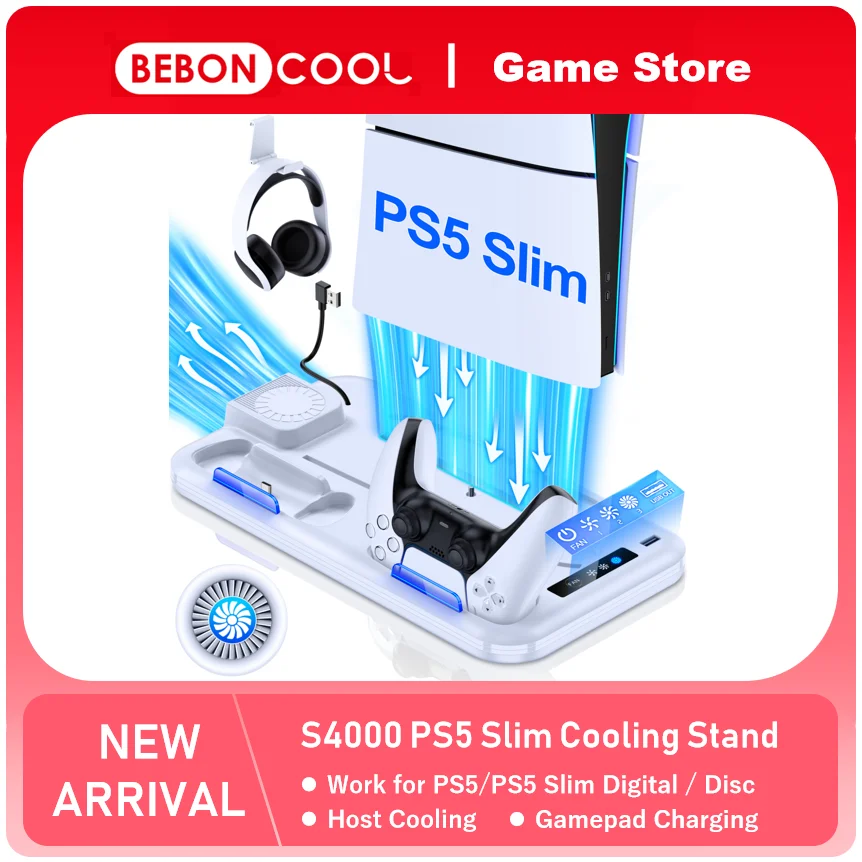 BEBONCOOL S4000 For PS5 Slim Disc/Digital Dual Fast Charging Cooling Stand Vertical Cooling Station For PlayStation 5