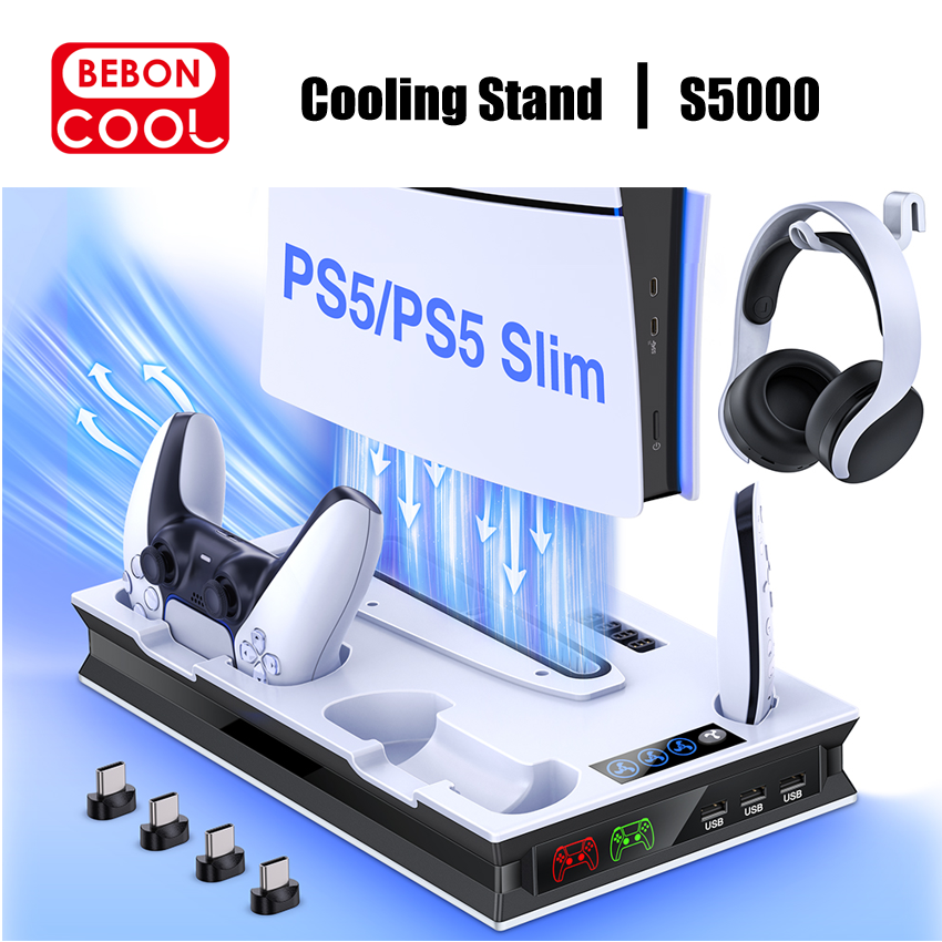 BEBONCOOL S5000 Vertical Stand For PS5 Slim Digital/Disc Cooling Station for PlayStation 5 Slim with Two Dual Fast Charging USB