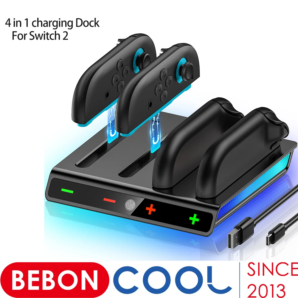 1. Simultaneous for 4 Joy Con Controller Charging – This charger dock compatible for Nintendo Switch 2 efficiently charges up to 4 controllers for Switch 2 Joycons at once. The smart layout with clear "+/-" markings prevents misplacement, while LED indicators show real-time charging status (red for charging, green for full)