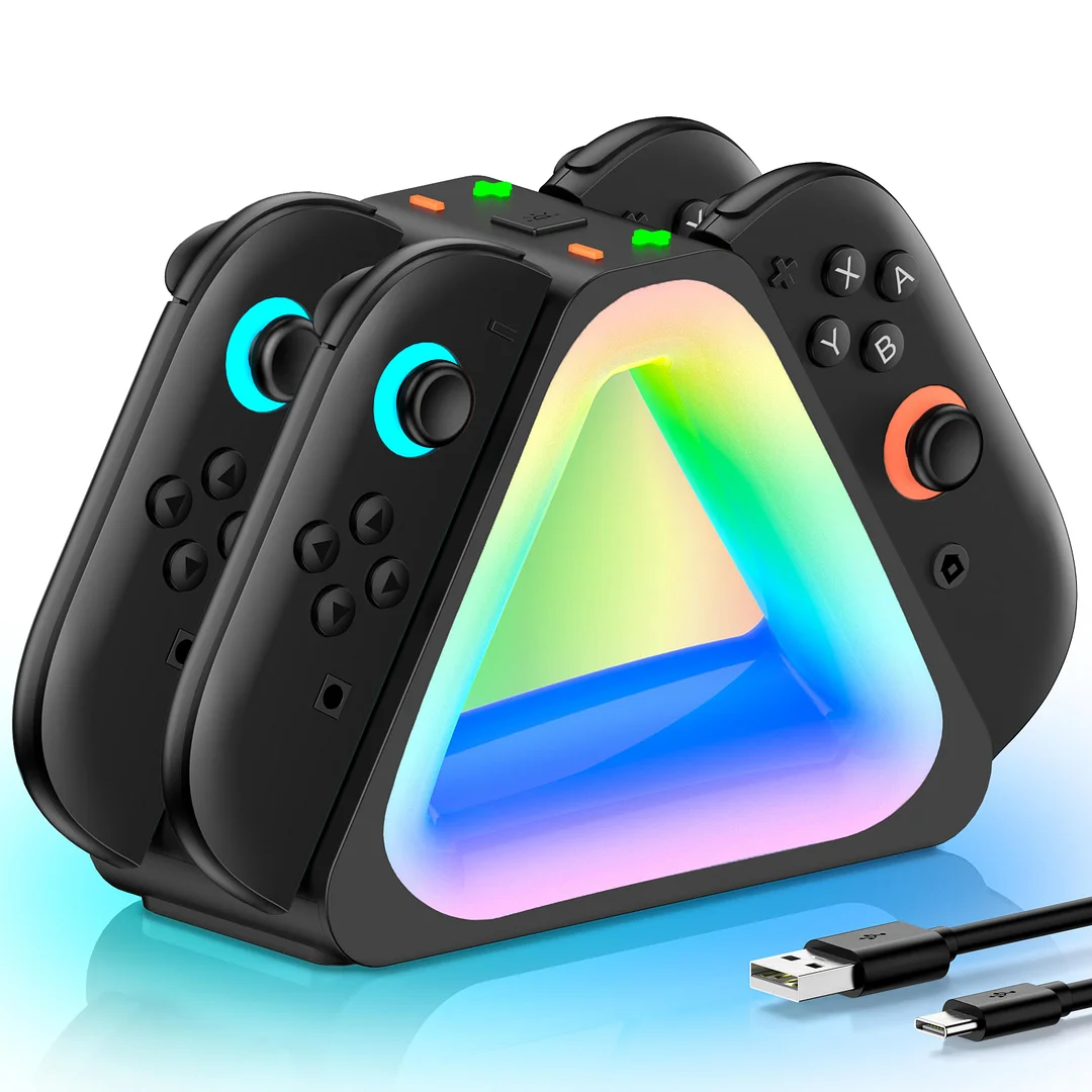 2. This charging base is specially designed for the SWITCH second-generation controller and can charge four controllers at the same time. The base is equipped with a clear charging indicator light, and the charging logo on the panel clearly distinguishes the "+" and "-" charging areas to prevent misplacement, and it is intuitive and convenient to use.