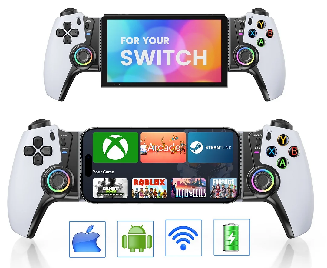 CROSS-PLATFORM WIRELESS GAMING -- Bluetooth 5.0 technology seamlessly connects to iPhone, Android phones, and Switch1/2, Switch OLED. The 10.5-20cm telescopic bracket with anti-slip rubber padding fits most smartphones and cases, mobile gaming controller perfect for popular phone games like CODM and Genshin Impact, as well as Switch Pro controller-supported games.